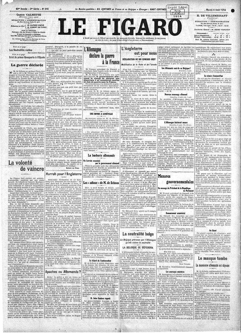 ![]() le lendemain de la déclaration de la guerre de l'Allemagne à la France. ![]() Fondé en 1826, Le Figaro fête ses 200 ans en 2026, deux siècles d’une aventure journalistique qui a marqué l’histoire de France, des salons littéraires du XIXe siècle aux débats numériques du XXIe. À l’origine, un journal satirique créé par Maurice Alhoy et Étienne Arago, qui tirait son nom d’un personnage de Beaumarchais – un valet malin et spirituel, symbole d’un ton impertinent et libre. Sous le Second Empire, Le Figaro devient un quotidien d’opinion, défendant les idées libérales et républicaines, avant de s’imposer comme un pilier de la presse conservatrice et indépendante. Hippolyte de Villemessant, son directeur emblématique au XIXe siècle, en fait un journal incontournable, mêlant politique, culture et chroniques mondaines, attirant les plumes les plus brillantes de l’époque. Le Figaro a publié les grands noms de la littérature : de Émile Zola à Marcel Proust, en passant par Colette ou Jean Cocteau, faisant du journal un lieu de dialogue entre journalisme et création. Le supplément littéraire, créé en 1894, est devenu une référence absolue, où s’expriment les critiques et les écrivains, façonnant le goût des lecteurs depuis plus d’un siècle. Au XXe siècle, le journal s’adapte aux bouleversements de l’histoire : guerres mondiales, décolonisation, mai 68… tout en restant fidèle à son style élégant et exigeant. Le "Figaro" est aussi un style : une mise en page soignée, une typographie reconnaissable, et une ligne éditoriale où l’analyse prime sur la sensation, le fond sur la forme. Dans les années 1970-1980, sous l’impulsion de Robert Hersant, le journal modernise sa diffusion et renforce son influence, tout en conservant son identité de "quotidien de référence". Le bicentenaire en 2026 est l’occasion de rappeler que Le Figaro a survécu à tous les régimes, toutes les crises, et toutes les révolutions technologiques, restant un acteur majeur de la presse française. Aujourd’hui, Le Figaro est bien plus qu’un journal : c’est un écosystème médiatique, avec son site internet, ses podcasts, ses newsletters, et ses événements culturels, touchant des millions de lecteurs. Les Unes du Figaro sont entrées dans l’histoire : qu’il s’agisse de couvrir un scandale politique, un événement culturel majeur, ou une crise internationale, le journal a toujours su marquer les esprits. Le Figaro a aussi formé des générations de journalistes, de Georges Clemenceau (qui y a écrit avant de devenir président du Conseil) aux plumes contemporaines comme Éric Zemmour ou Nathalie Schuck. Son indépendance – parfois contestée, souvent revendiquée – est un marqueur fort de son identité, même si son positionnement éditorial a pu évoluer avec les époques. En 2026, Le Figaro célèbre aussi l’art de la controverse : un journal qui n’a jamais craint les débats, les polémiques, ou les prises de position tranchées. |