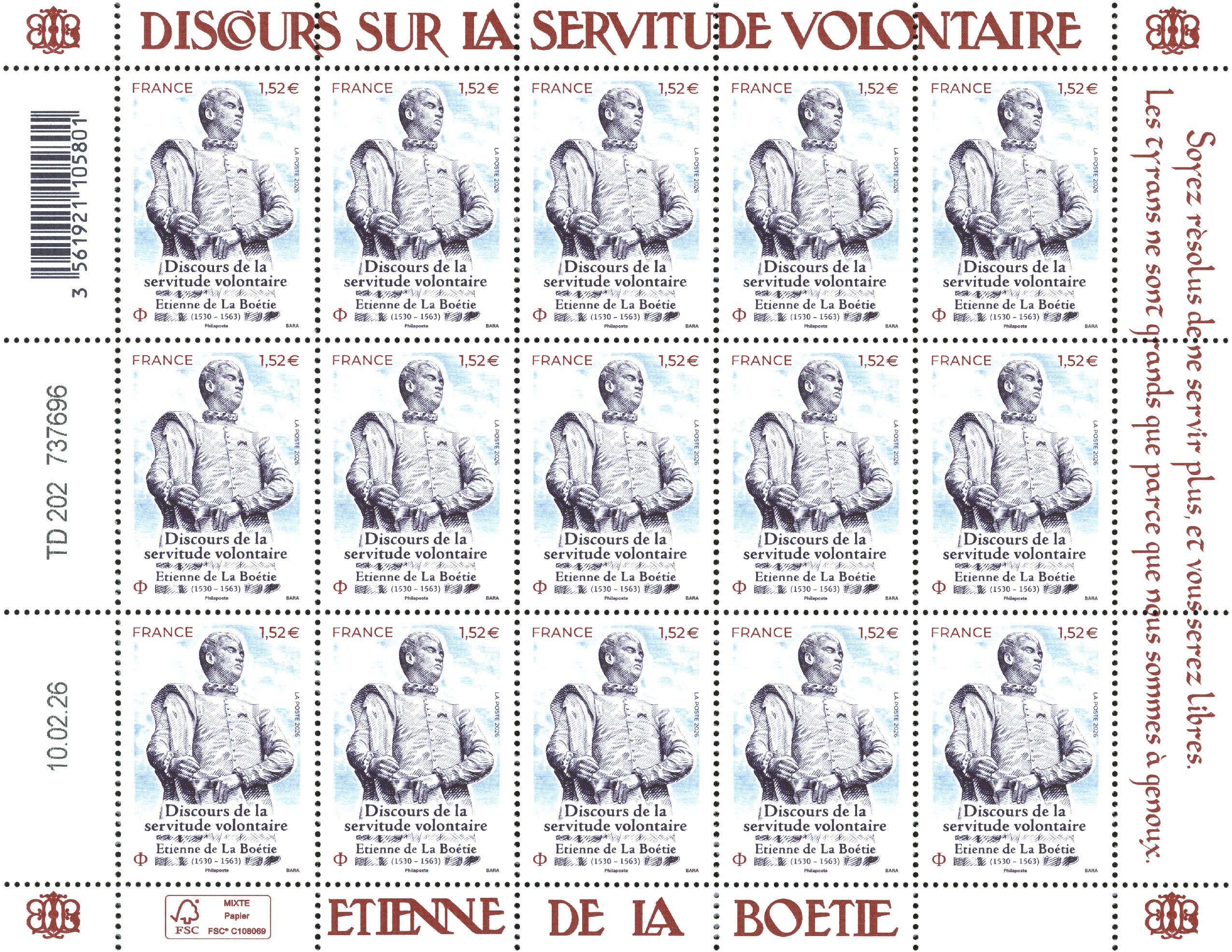 Le timbre émis le 18 mai 2026 célèbre Étienne de La Boétie (1530–1563), humaniste et magistrat bordelais, auteur du Discours de la servitude volontaire.